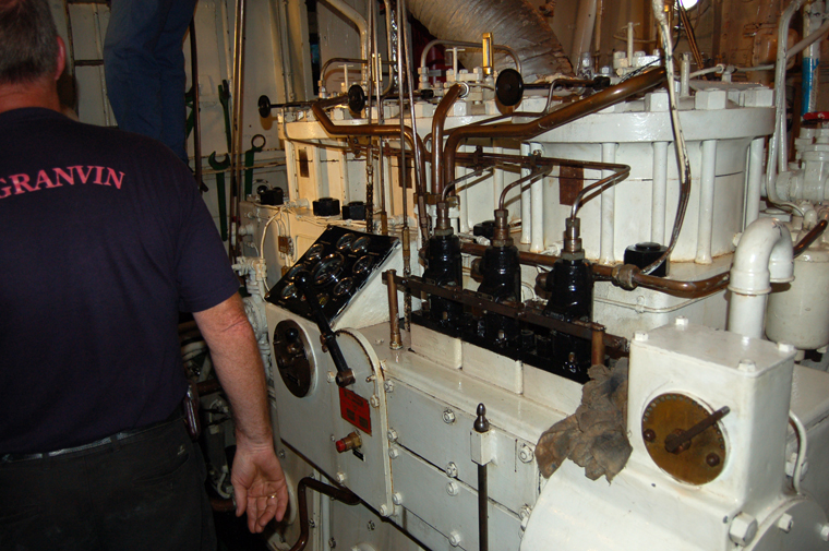 The main engine, a Wichmann 3-cyl. diesel of 300 HP, controled by cables from the bridge.
