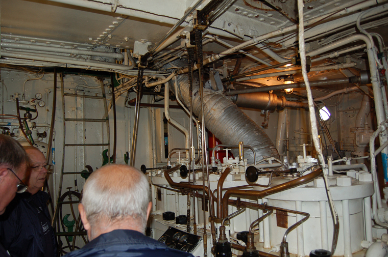 The main engine, a Wichmann 3-cyl. diesel of 300 HP, controled by cables from the bridge.