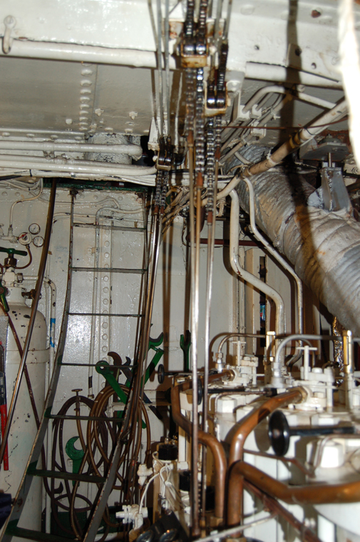 The main engine, a Wichmann 3-cyl. diesel of 300 HP, controled by cables from the bridge.