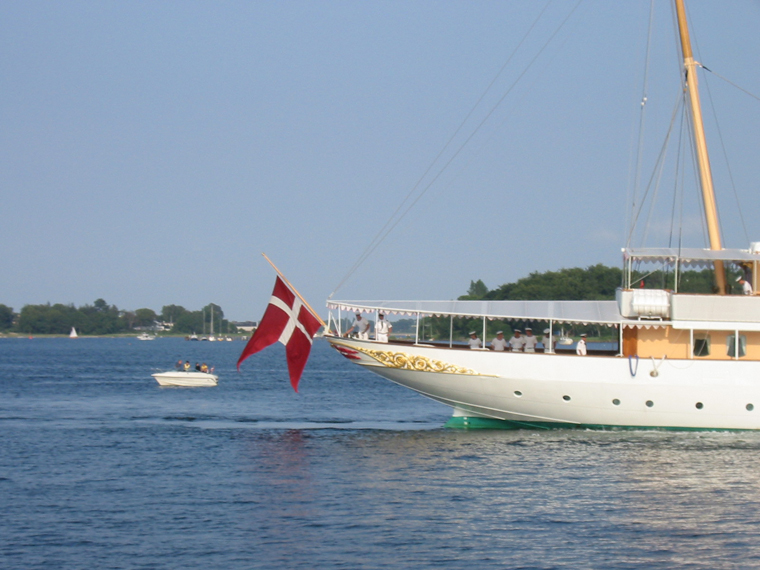 The danish royal yacht Dannebrog is arriving at Svendborg havn, Denmark.