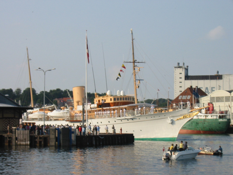 The danish royal yacht Dannebrog is arriving at Svendborg havn, Denmark.