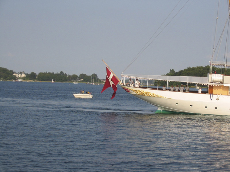 The danish royal yacht Dannebrog is arriving at Svendborg havn, Denmark.