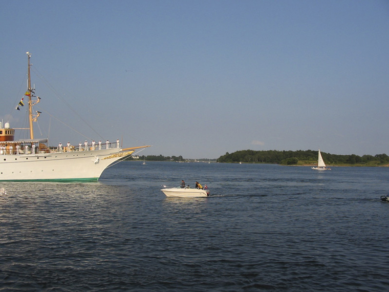 The danish royal yacht Dannebrog is arriving at Svendborg havn, Denmark.