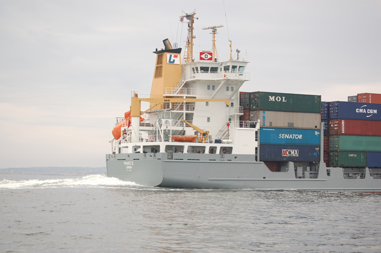 A container-feeder, M/S Maike D, heading for Gothenburg, Sweden