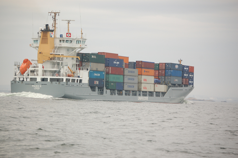 A container-feeder, M/S Maike D, heading for Gothenburg, Sweden