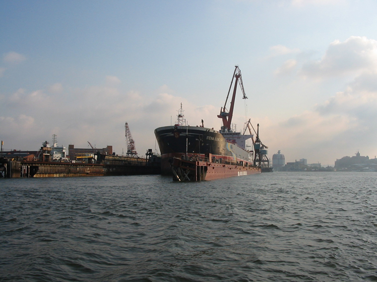 A Stena Line bulk-carrier beeing shepparded into a drydock in Gotheburg harbour.