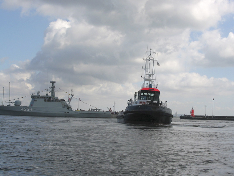 A tug is making pirouettes in the harbour