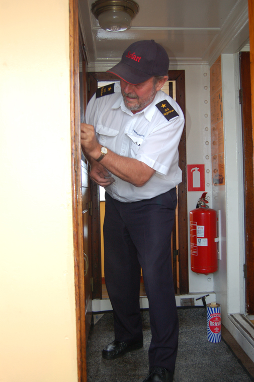 En route to Elsinore, Denmark, everything was polished. The captain, Niels Ole Kainø, is polishing brass-fittings.