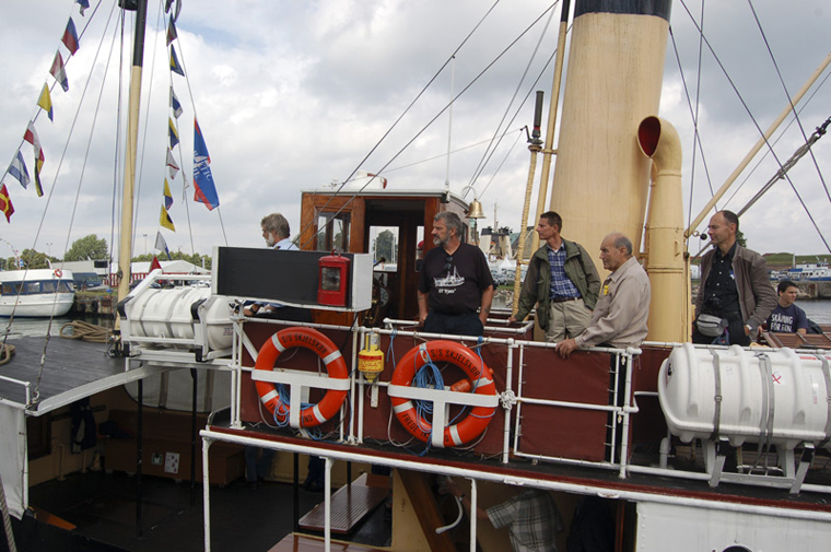 Passengers getting ready to disembark. The captain, Frits Holm Hansen is on the bridge.