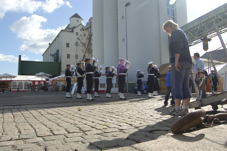 Søværnet Tambourkorps kom forbi. Kirsten Pontoppidan ser på
