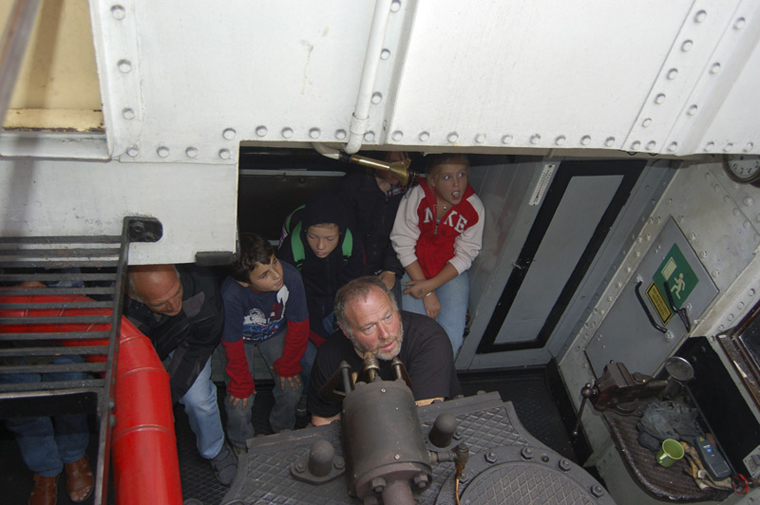Young passengers in the engine room, They recieve an explanation and a piece of coal by John Olsen.