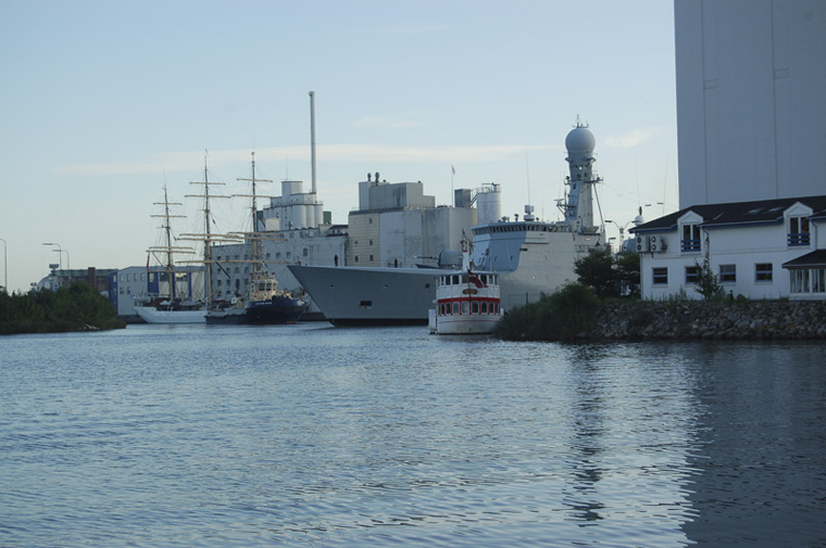 The offshore patrol frigate Thetis (F357) arrives at Odense harbour. In the foreground is the 'false' paddle wheel steamer, M/S Agnete from Haderslev, Denmark