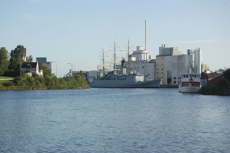 The corvette Olfert Fischer (P355) arrives at Odense harbour. In the foreground is the 'false' paddle wheel steamer, M/S Agnete from Haderslev, Denmark