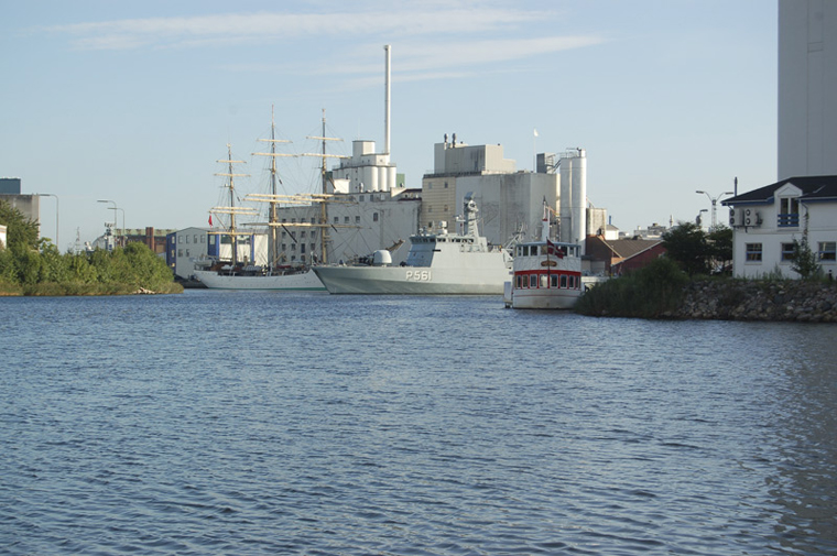 The patrolvessel Skaden (P561) arrives at Odense harbour. In the foreground is the 'false' paddle wheel steamer, M/S Agnete from Haderslev, Denmark
