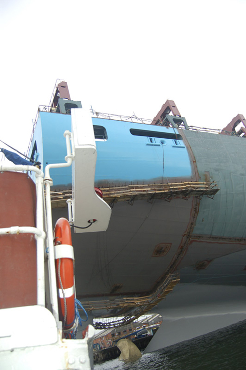 We sailed to the Lindø shipyard during a VIP-trip. We saw a new - very large - PS-series container vessel to Maersk Line during fittig-out.