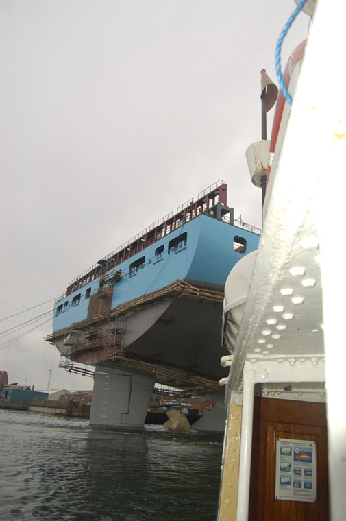 We sailed to the Lindø shipyard during a VIP-trip. We saw a new - very large - PS-series container vessel to Maersk Line during fittig-out.