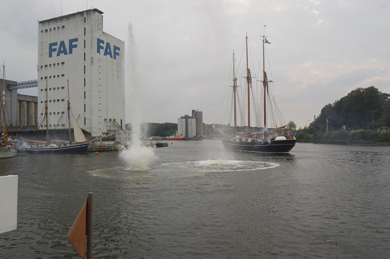 The battle at Kolberger Heide, Germany, in 1644 was replayed in Odense harbour with sailyachts as props, a lot of smoke, many gunshots am big bombs in the water, sending watercolumns 2030 meters into the air.