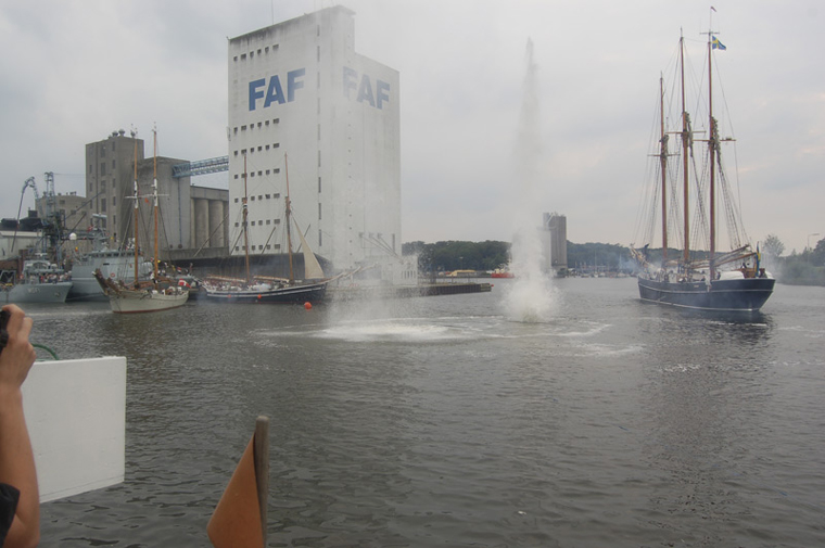 The battle at Kolberger Heide, Germany, in 1644 was replayed in Odense harbour with sailyachts as props, a lot of smoke, many gunshots am big bombs in the water, sending watercolumns 2030 meters into the air.