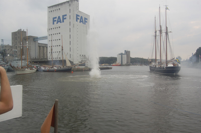 The battle at Kolberger Heide, Germany, in 1644 was replayed in Odense harbour with sailyachts as props, a lot of smoke, many gunshots am big bombs in the water, sending watercolumns 2030 meters into the air.