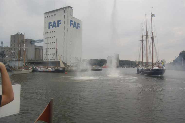 The battle at Kolberger Heide, Germany, in 1644 was replayed in Odense harbour with sailyachts as props, a lot of smoke, many gunshots am big bombs in the water, sending watercolumns 2030 meters into the air.