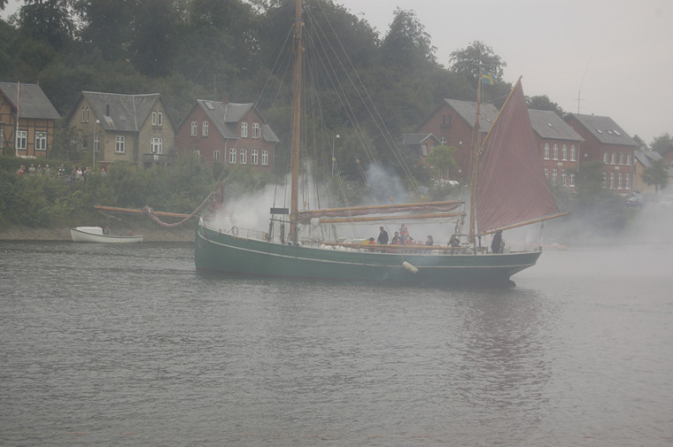 The battle at Kolberger Heide, Germany, in 1644 was replayed in Odense harbour with sailyachts as props, a lot of smoke, many gunshots am big bombs in the water, sending watercolumns 2030 meters into the air.