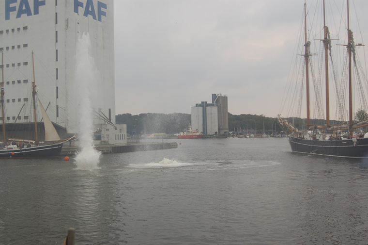 The battle at Kolberger Heide, Germany, in 1644 was replayed in Odense harbour with sailyachts as props, a lot of smoke, many gunshots am big bombs in the water, sending watercolumns 2030 meters into the air.
