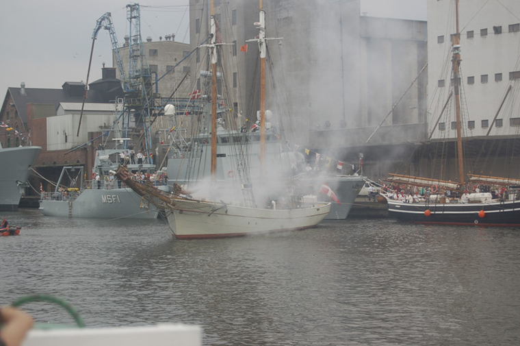 The battle at Kolberger Heide, Germany, in 1644 was replayed in Odense harbour with sailyachts as props, a lot of smoke, many gunshots am big bombs in the water, sending watercolumns 2030 meters into the air.