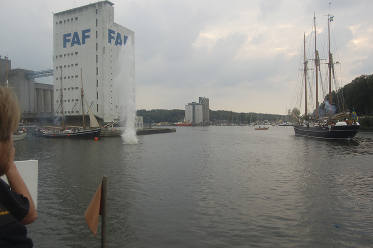 The battle at Kolberger Heide, Germany, in 1644 was replayed in Odense harbour with sailyachts as props, a lot of smoke, many gunshots am big bombs in the water, sending watercolumns 2030 meters into the air.