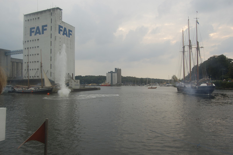 The battle at Kolberger Heide, Germany, in 1644 was replayed in Odense harbour with sailyachts as props, a lot of smoke, many gunshots am big bombs in the water, sending watercolumns 2030 meters into the air.