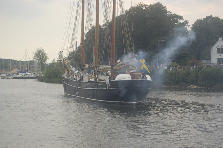 The battle at Kolberger Heide, Germany, in 1644 was replayed in Odense harbour with sailyachts as props, a lot of smoke, many gunshots am big bombs in the water, sending watercolumns 2030 meters into the air.