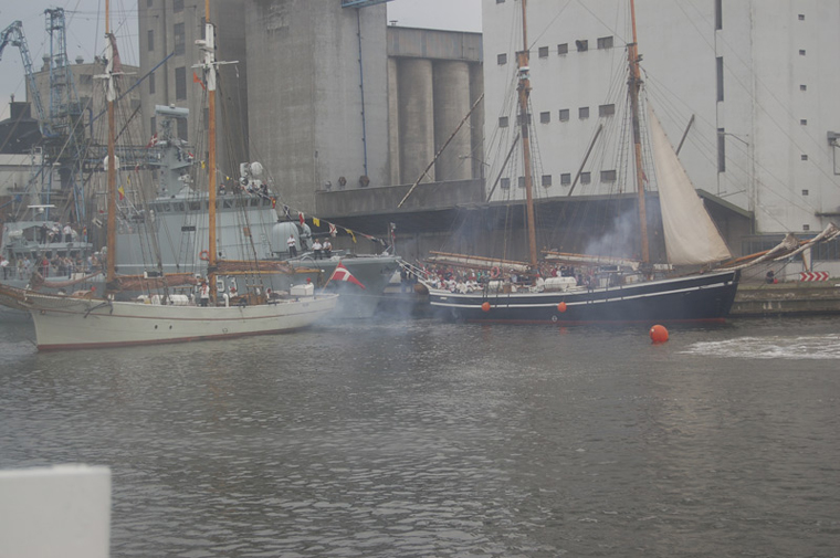 The battle at Kolberger Heide, Germany, in 1644 was replayed in Odense harbour with sailyachts as props, a lot of smoke, many gunshots am big bombs in the water, sending watercolumns 2030 meters into the air.