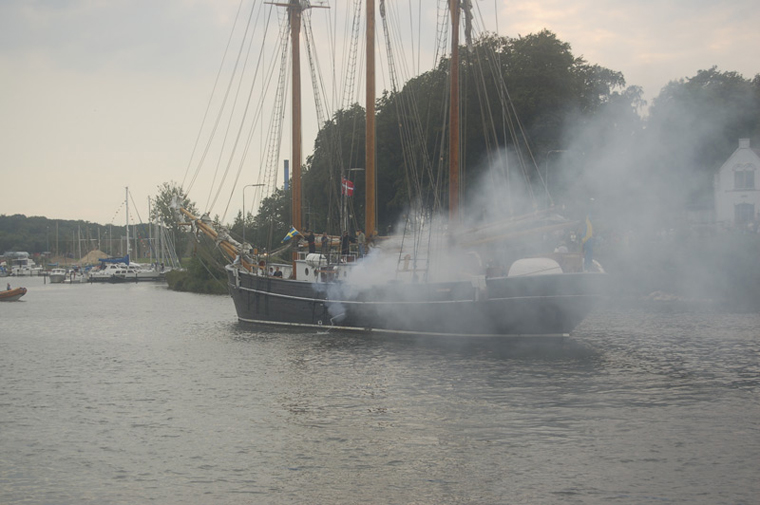 The battle at Kolberger Heide, Germany, in 1644 was replayed in Odense harbour with sailyachts as props, a lot of smoke, many gunshots am big bombs in the water, sending watercolumns 2030 meters into the air.