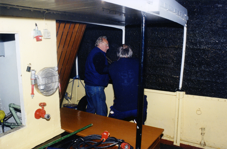 Tage Mikkelsen and Carl Nielsen keeps a clearance between the ship and the lock-wall in Trollhättan , Sweden.
