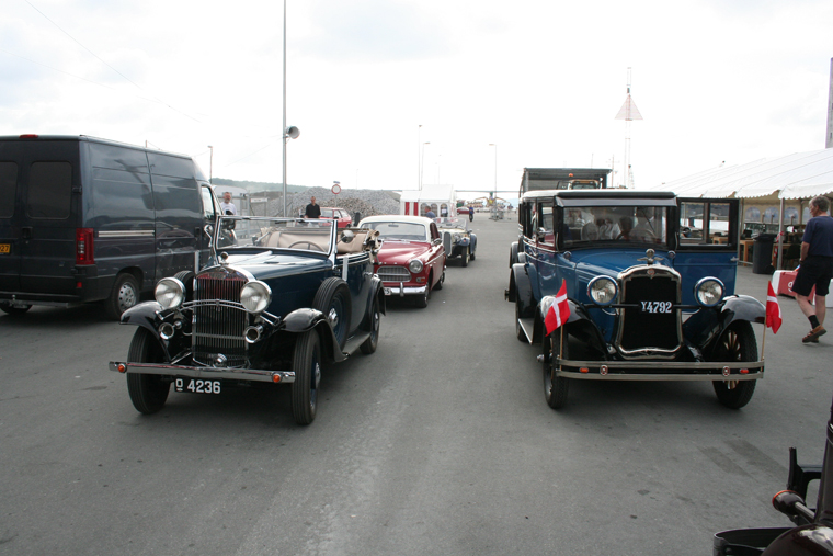 Veteran cars is starting the parade with crew members from the ships.