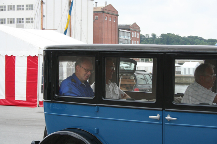 Veteran cars is starting the parade with crew members from the ships.